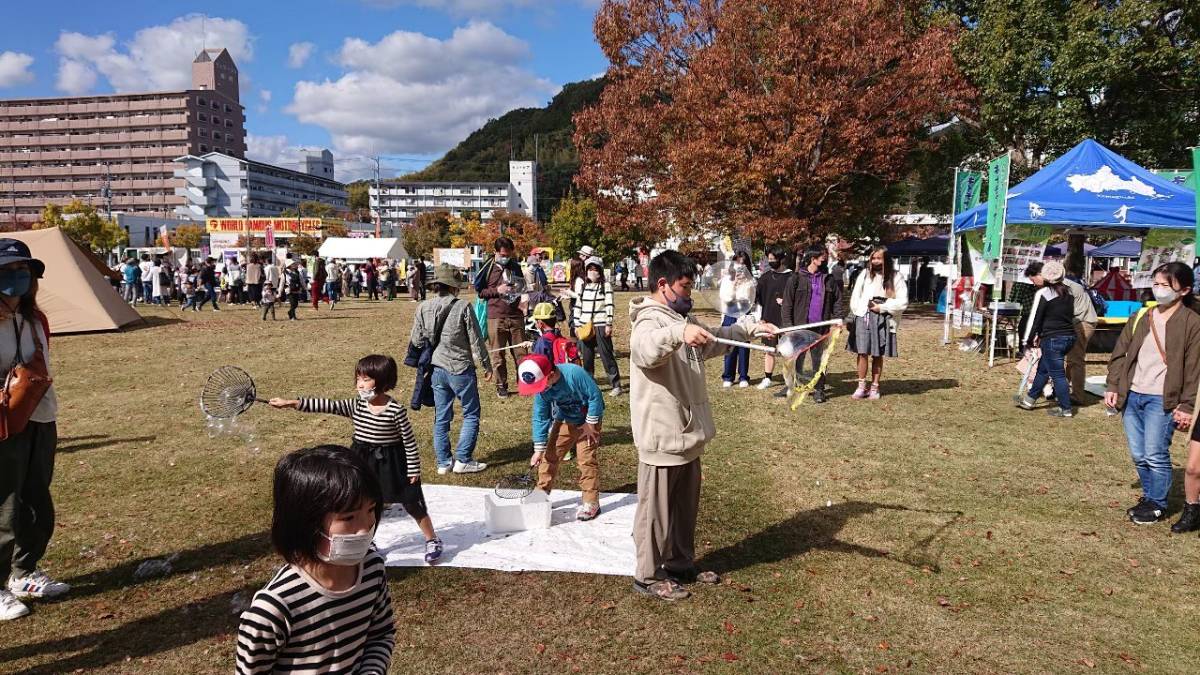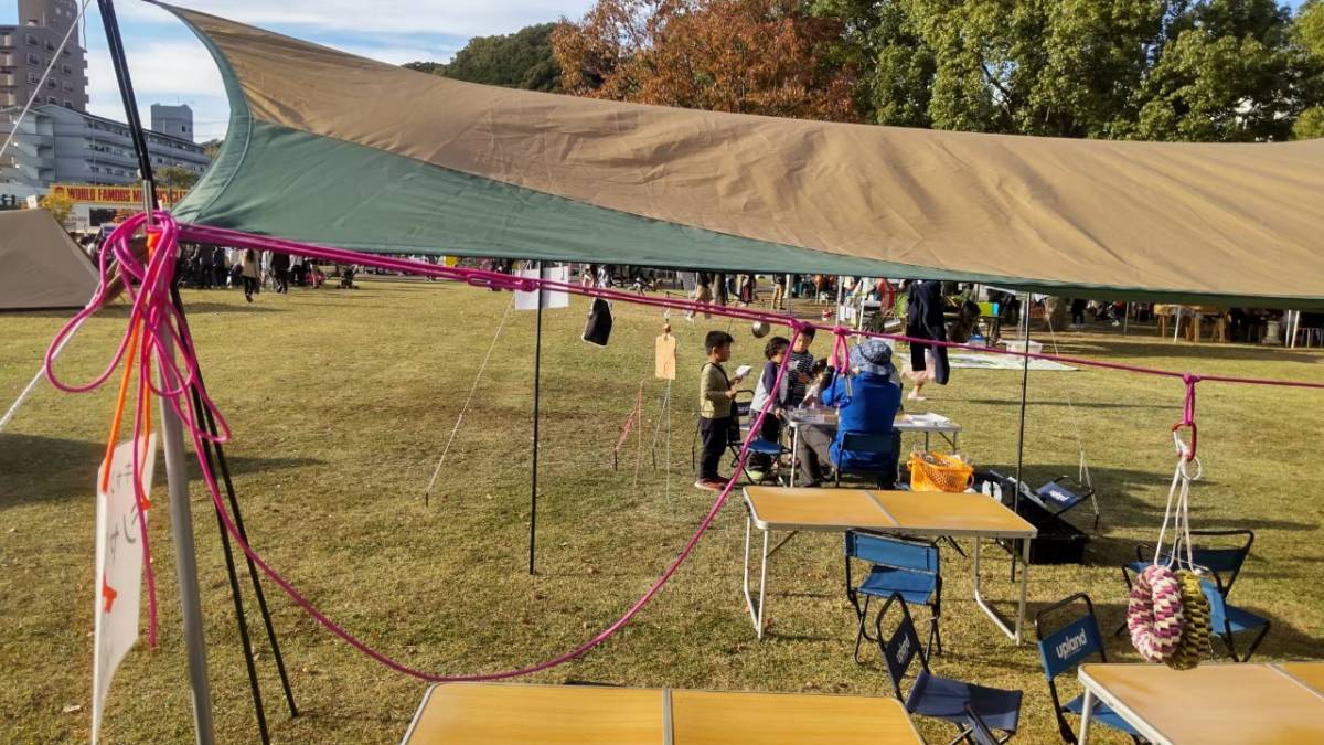 山口中央公園にて行われた、「FAMILY FESTIVAALI」にブース出展として参加しました。キャンプ展示や飯ごうポップコーン体験、モルック体験、ロープワーク体験、シャボン玉、よく飛ぶ紙飛行機などを準備し、参加者へ体験活動を行った。
